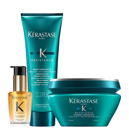 Detalhes Kit Kérastase Résistance Thérapiste Limpeza e Força (2 Produtos) Kit com shampoo e máscara para cabelos com danos profundos causados pela química sucessiva. Kérastase Rési