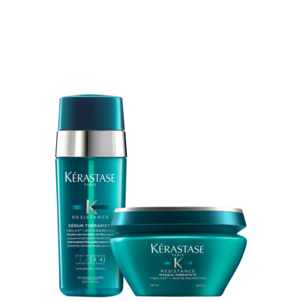 Detalhes Kit Kérastase Résistance Thérapiste Força e Reconstrução (2 Produtos) Kit com máscara e sérum para cabelos com danos profundos causados pela química sucessiva. Kérastase R