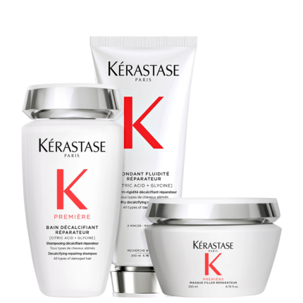 Detalhes Kit Kérastase Première Réparateur Trio (3 Produtos) Kit com shampoo, condicionador e máscara para cabelos danificados. Kérastase Première Réparateur Trio ajuda a recriar a