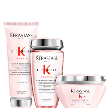 Detalhes Kit Kérastase Genesis Trio (3 Produtos) Kit com shampoo, condicionador e máscara capilar. Kérastase Genesis Trio limpa delicadamente e fortalece a fibra desde a raiz. O Ki