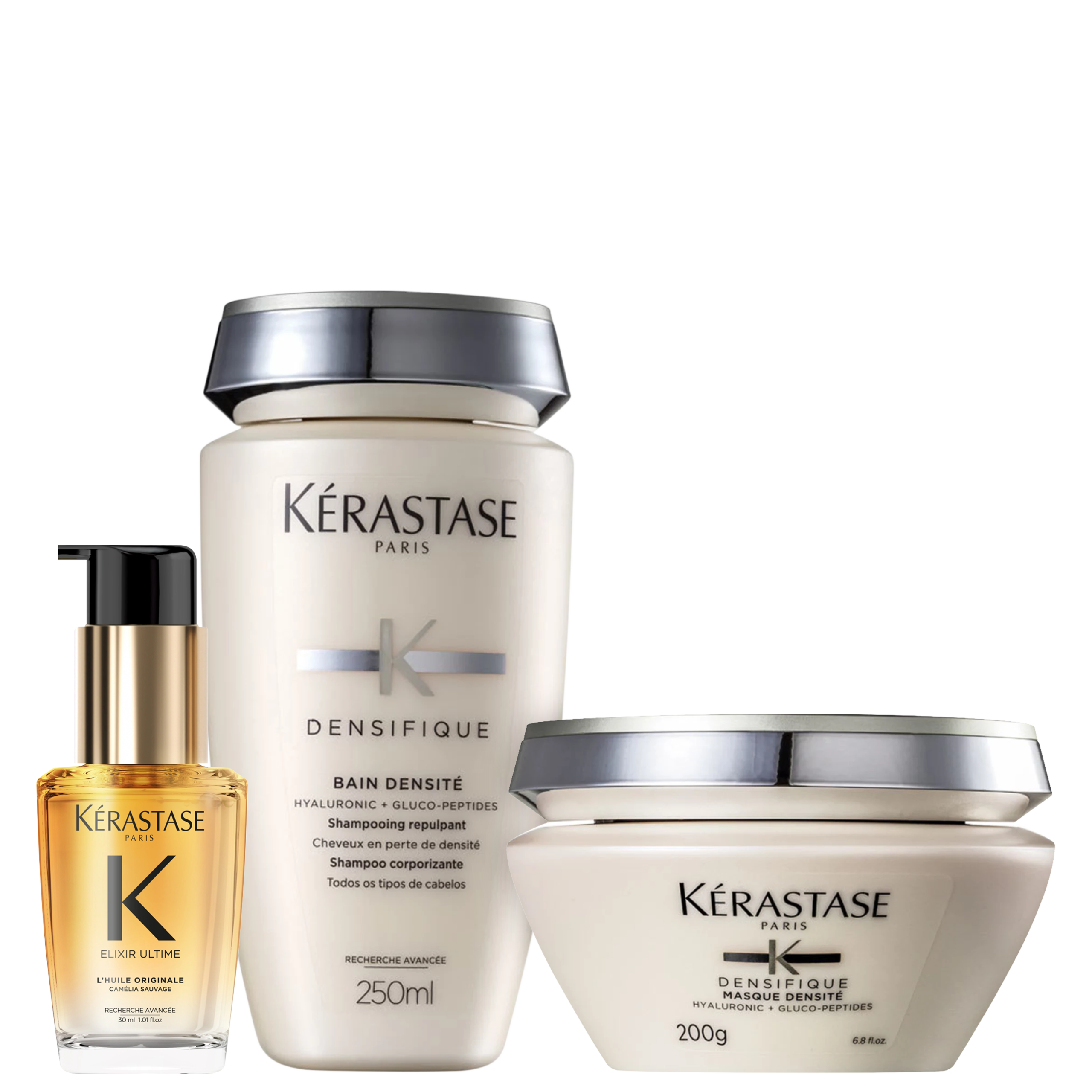 Detalhes Kit Kérastase Densifique L’Huile Originale Travel Size Trio (3 Produtos) Kit com shampoo, máscara e óleo, com embalagem travel size, para cabelos ralos ou com afinamento. Kérastase Densifique L’Huile Originale Travel Size Trio .um trio poderoso para combater a falta de densidade e volume. O Kit Kérastase Densifique L’Huile Originale Travel Size Trio começa o tratamento com o Shampoo Bain Densité, que limpa suavemente enquanto prepara os fios para a Máscara Densifique, um tratamento intensivo que fortalece e densifica a fibra capilar. O toque final fica por conta do Óleo Capilar Elixir Ultime L’Huile Originale, que proporciona brilho radiante, maciez e proteção contra os danos externos.