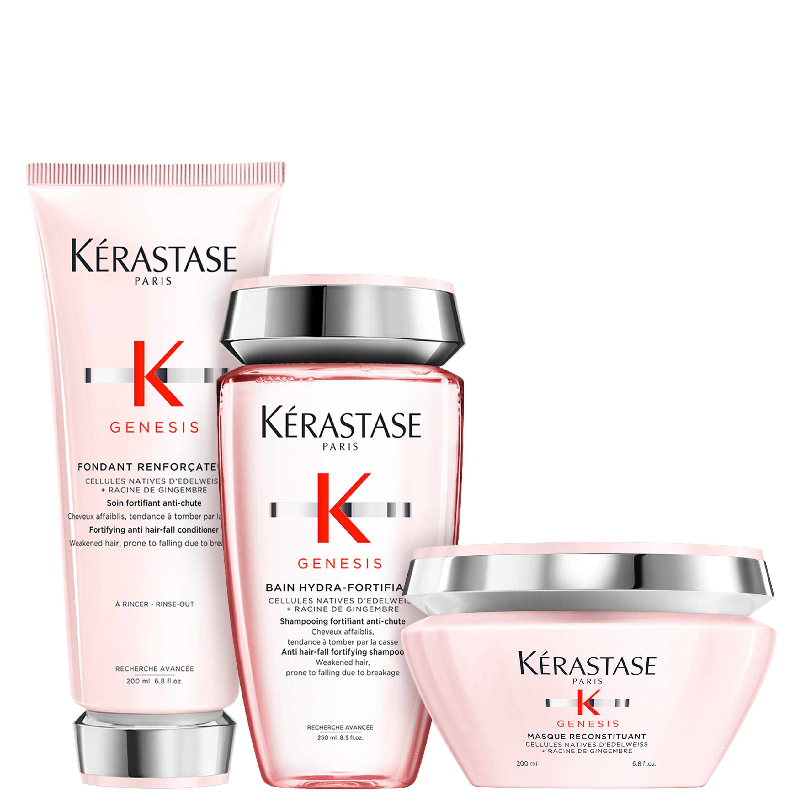 Detalhes Kit Kérastase Genesis Trio (3 Produtos) Kit com shampoo, condicionador e máscara capilar. Kérastase Genesis Trio limpa delicadamente e fortalece a fibra desde a raiz. O Kit Kérastase Genesis Trio entrega uma formulação ultra-delicada. É enriquecido com os potentes Células Nativas de Eldelweiss e Raiz de Gengibre, para crescimento nutrido e fortalecido. Seus ativos agem instantaneamente para entregar um cabelo mais bonito, forte e macio.