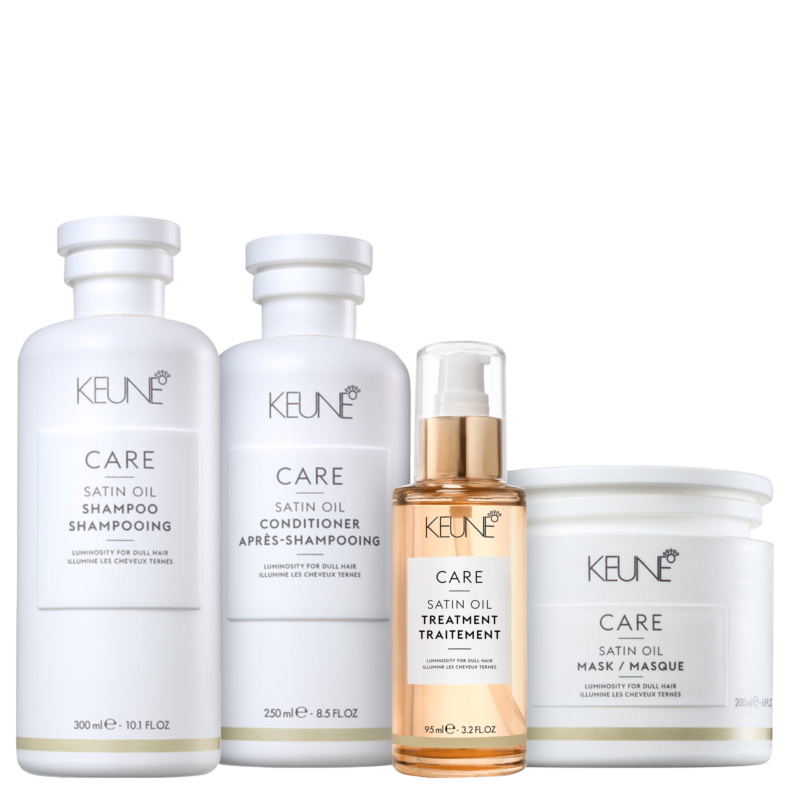 Detalhes Kit Keune Satin Oil Treatment (4 Produtos) Kit de tratamento para cabelos ressecados. Keune Satin Oil Treatment nutre e hidrata com fórmula à base de óleos para fios mais brilhantes. O Kit Keune Satin Oil Treatment conta com a nova tecnologia com complexo de minerais essenciais que levam a nutrição que os fios precisam para conservar a hidratação por mais tempo. Fórmulas que não deixam o cabelo pesado e proporcionam luminosidade e maciez intensas. Contém: Keune Care Satin Oil – Shampoo 300ml: devolve o brilho e a maciez dos fios com leveza Keune Care Satin Oil – Condicionador 250ml: deixa o cabelo leve e macio com o aumento do brilho e do desembaraço Keune Care Satin Oil – Máscara 200ml: hidrata e nutre profundamente enquanto trata a saúde do cabelo de dentro para fora Keune Care Satin Oil Treatment – Óleo Finalizador 95ml: recupera a saúde, a maciez e o brilho com nutrientes essenciais