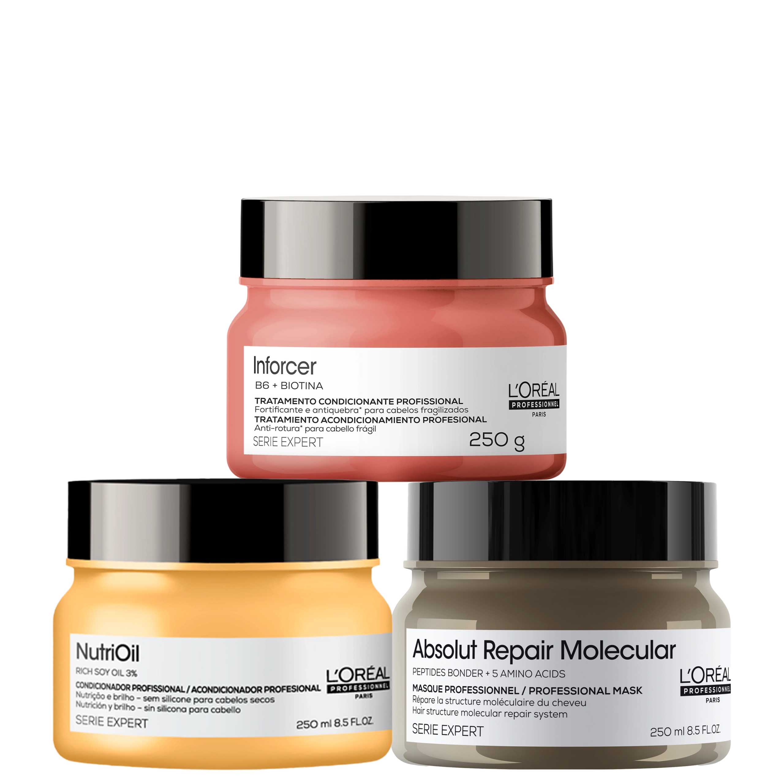 Detalhes Kit L’Oréal Professionnel Absolut Repair Molecular + NutriOil + Inforcer Masks (3 Produtos) Kit com máscaras capilares para cabelos danificados, ressecados, frágeis e quebradiços. L’Oréal Professionnel Absolut Repair Molecular + NutriOil + Inforcer Masks três passos incríveis para fios radiantes, saudáveis e fortes. O Kit L’Oréal Professionnel Absolut Repair Molecular + NutriOil + Inforcer Masks apresenta um tratamento potente para cabelos enfraquecidos, fortifica e repara a fibra capilar. Enquanto outro, com sua tecnologia inovadora, repara os danos e fortalece a fibra capilar, proporcionando um toque sedoso, e um um tratamento intensivo de nutrição, devolve a maciez, o brilho e a vitalidade aos fios.