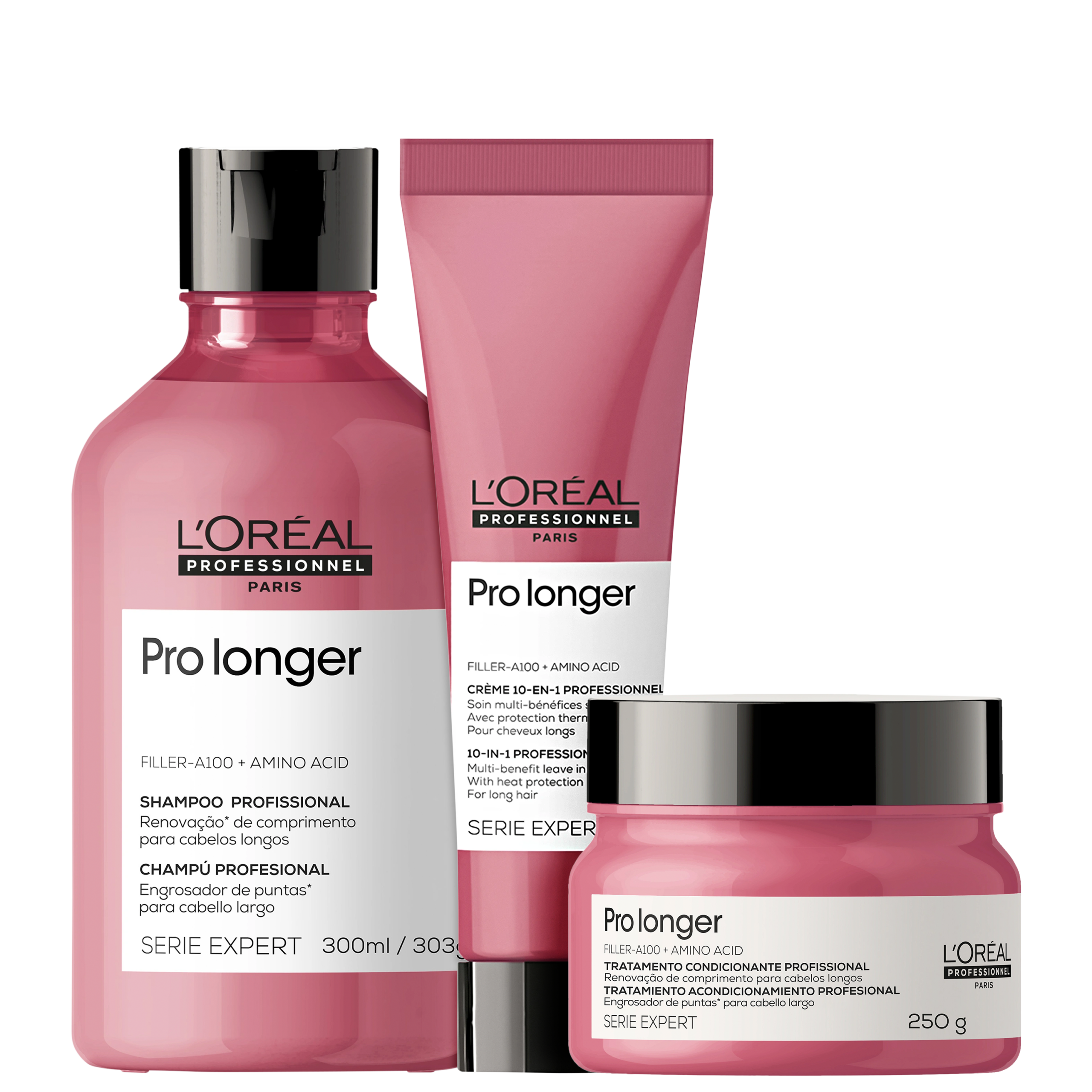 Detalhes Kit L’Oréal Professionnel Serie Expert Pro Longer Preenchimento de Pontas (3 Produtos) Kit de tratamento preenchedor de pontas para cabelos grossos com pontas afinadas. Kit L’Oréal Professionnel Serie Expert Pro Longer Preenchimento de Pontas ajuda a renovar instantaneamente a fibra capilar por dentro e pela superfície enquanto garante hidratação completa aos fios. Kit L’Oréal Professionnel Serie Expert Pro Longer Preenchimento de Pontas repara as pontas duplas, proporciona 5X mais brilho, deixa o cabelo mais maleável, além de oferecer proteção térmica e ação antifrizz. Contém: L’Oréal Professionnel Serie Expert Pro Longer – Shampoo 300ml: limpa, devolve a densidade às pontas e garante brilho. L’Oréal Professionnel Serie Expert Pro Longer – Máscara Capilar 250g: hidrata e proporciona preenchimento das pontas danificadas e afinadas. L’Oréal Professionnel Serie Expert Pro Longer – Leave-in 150ml: controla o frizz, oferece proteção térmica e mantém os fios alinhados.