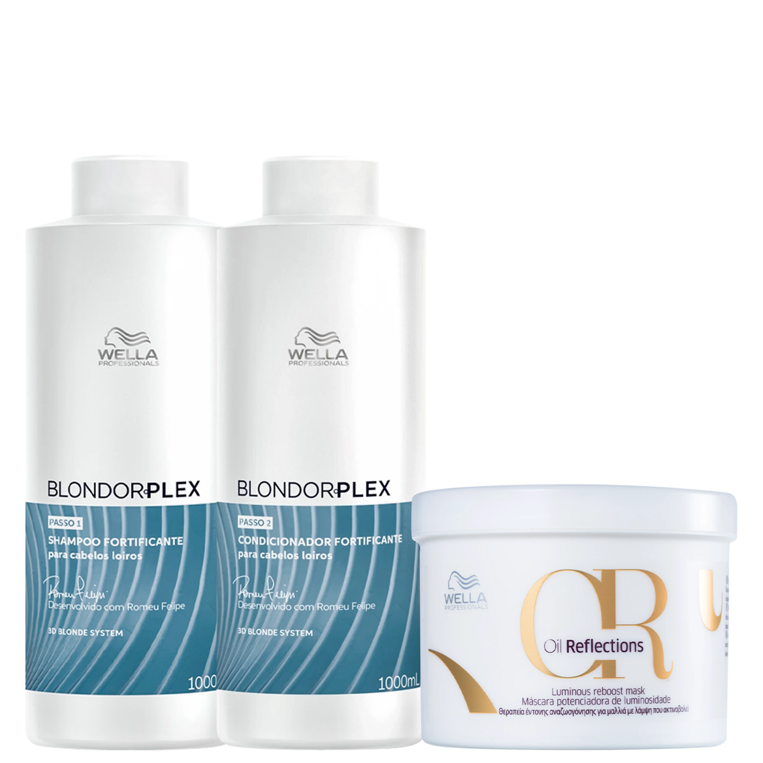 Detalhes Kit Wella Professionals BlondorPlex Oil Reflections Super (3 Produtos) Kit com shampoo, condicionador e máscara para cabelos loiros. Wella Professionals BlondorPlex Oil Reflections Super entrega força e luminosidade aos fios. O Kit Wella Professionals BlondorPlex Oil Reflections Super é ideal para um tratamento intenso para cabelos loiros, proporcionando uma experiência única de cuidado. Com produtos em tamanho profissional que atuam em conjunto para fortalecer, reparar, hidratar e proteger os fios, este kit garante cabelos mais fortes, saudáveis e com um brilho radiante. *BlondorPlex é a nova linha de tratamento de Wella Professionals assinada por Romeu Felipe. O melhor tratamento para cabelos descoloridos, com luzes ou mechas. Cabelos até 97% mais fortes e resistentes à quebra.