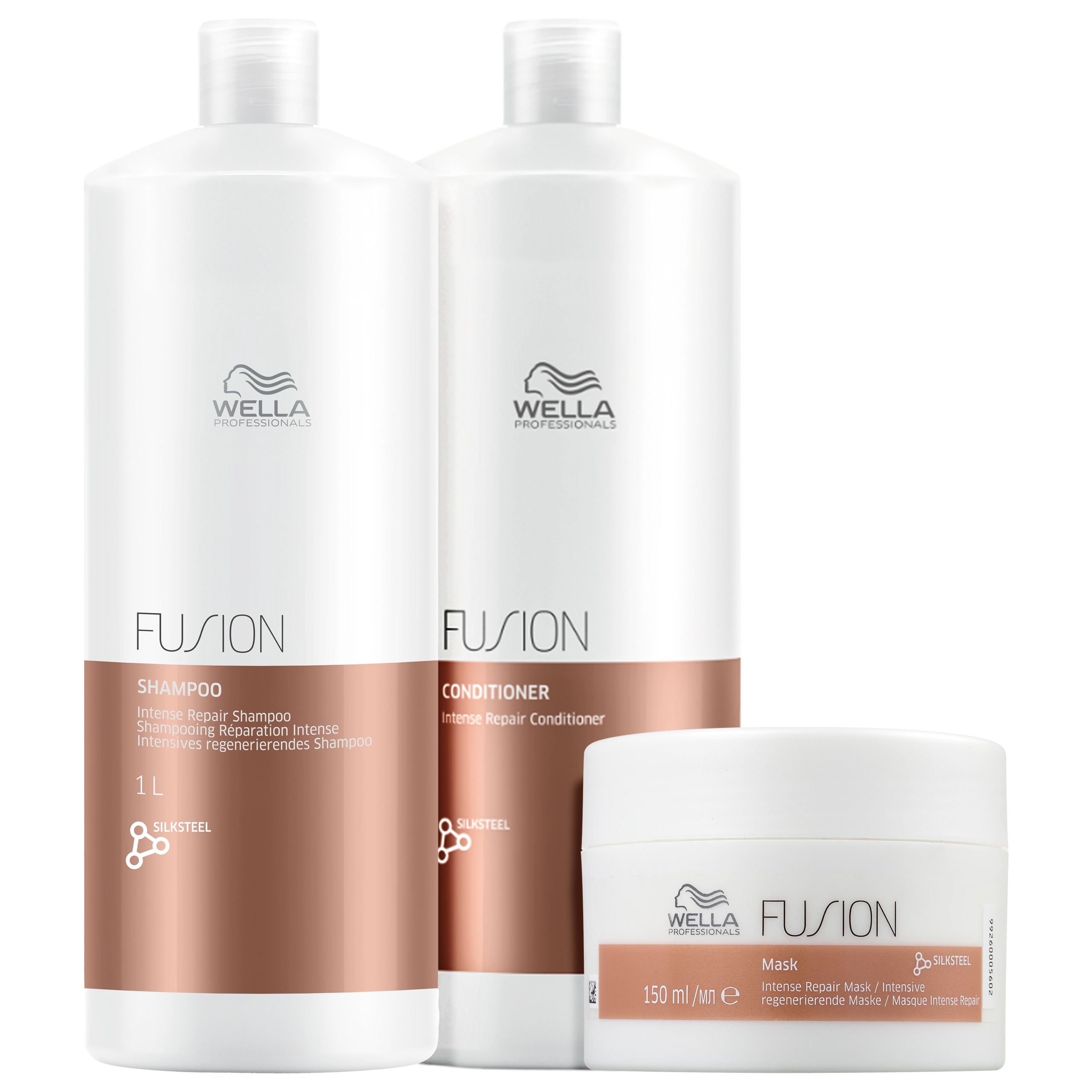 Detalhes Kit Wella Professionals Fusion Trio Super Salon (3 Produtos) Kit com shampoo e condicionador, tamanho profissional, e máscara para cabelos danificados. Wella Professionals