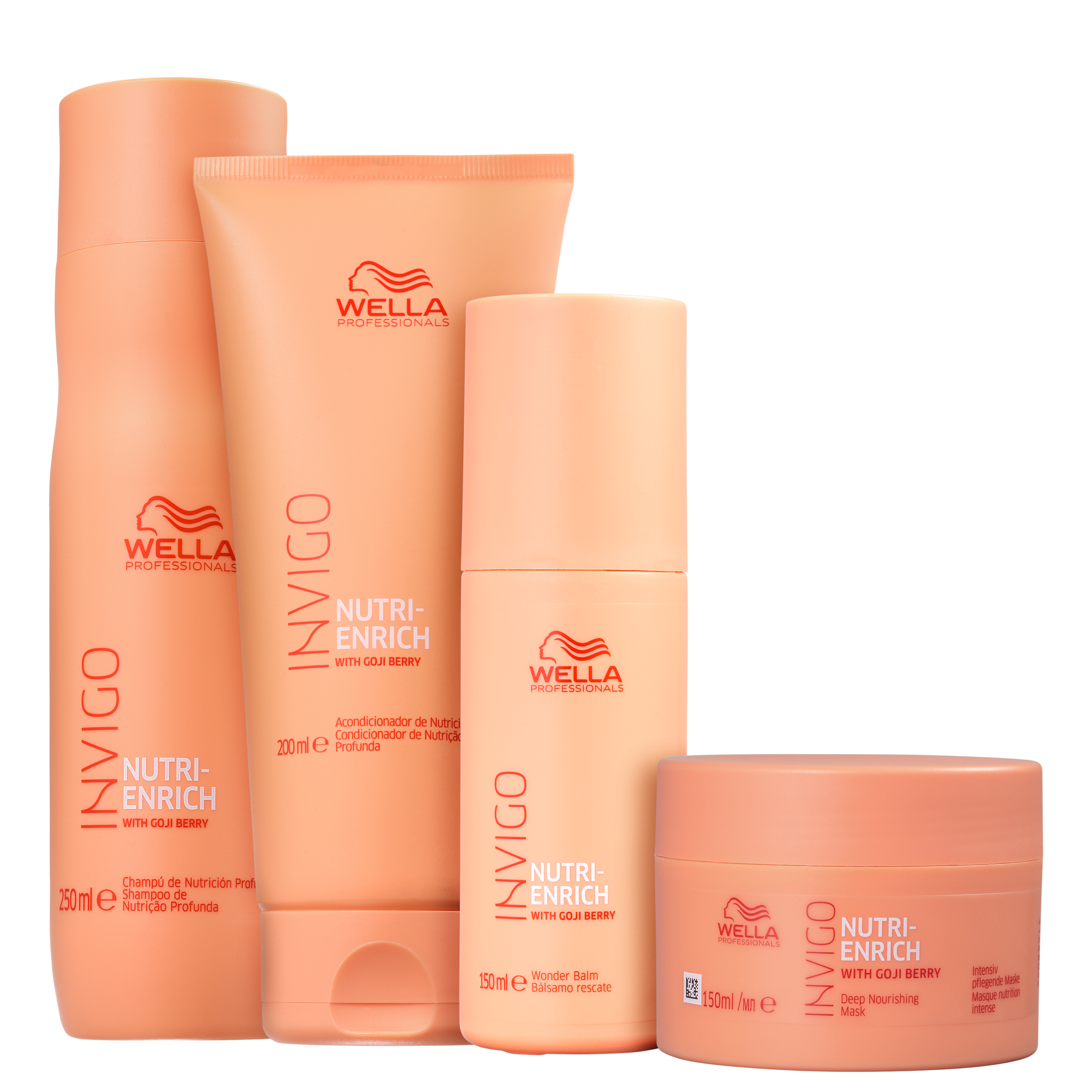 Detalhes Kit Wella Professionals Invigo Nutri-Enrich Wonder Balm (4 Produtos) Kit de tratamento para cabelos secos, ressecados ou quimicamente tratados. Wella Professionals Invigo Nutri-Enrich Wonder Balm traz fórmulas que nutrem e hidratam para promover brilho, suavidade, flexibilidade e movimento aos fios. O Kit Wella Professionals Invigo Nutri-Enrich Wonder Balm conta com vitaminas e nutrientes que conseguem penetrar nas fibras capilares. Assim, melhoram a qualidade do cabelo enquanto suavizam sua superfície para garantir maciez e luminosidade. Isso tudo aliado a uma fragrância luxuosa frutal chipre almiscarada. Dougllas Dias, embaixador Wella Professionals que assinou o look da campanha de Invigo Nutri-Enrich, diz: “O que eu mais gosto dessa linha, é que ela deixa o cabelo cada vez mais tratado, com um toque sedoso, macio e muito brilho. E ainda é possível intercalar com outros produtos Invigo, como da linha Balance para cuidar do seu couro cabeludo ou a Color Brilliance, para quem tem cabelo colorido, por exemplo”.