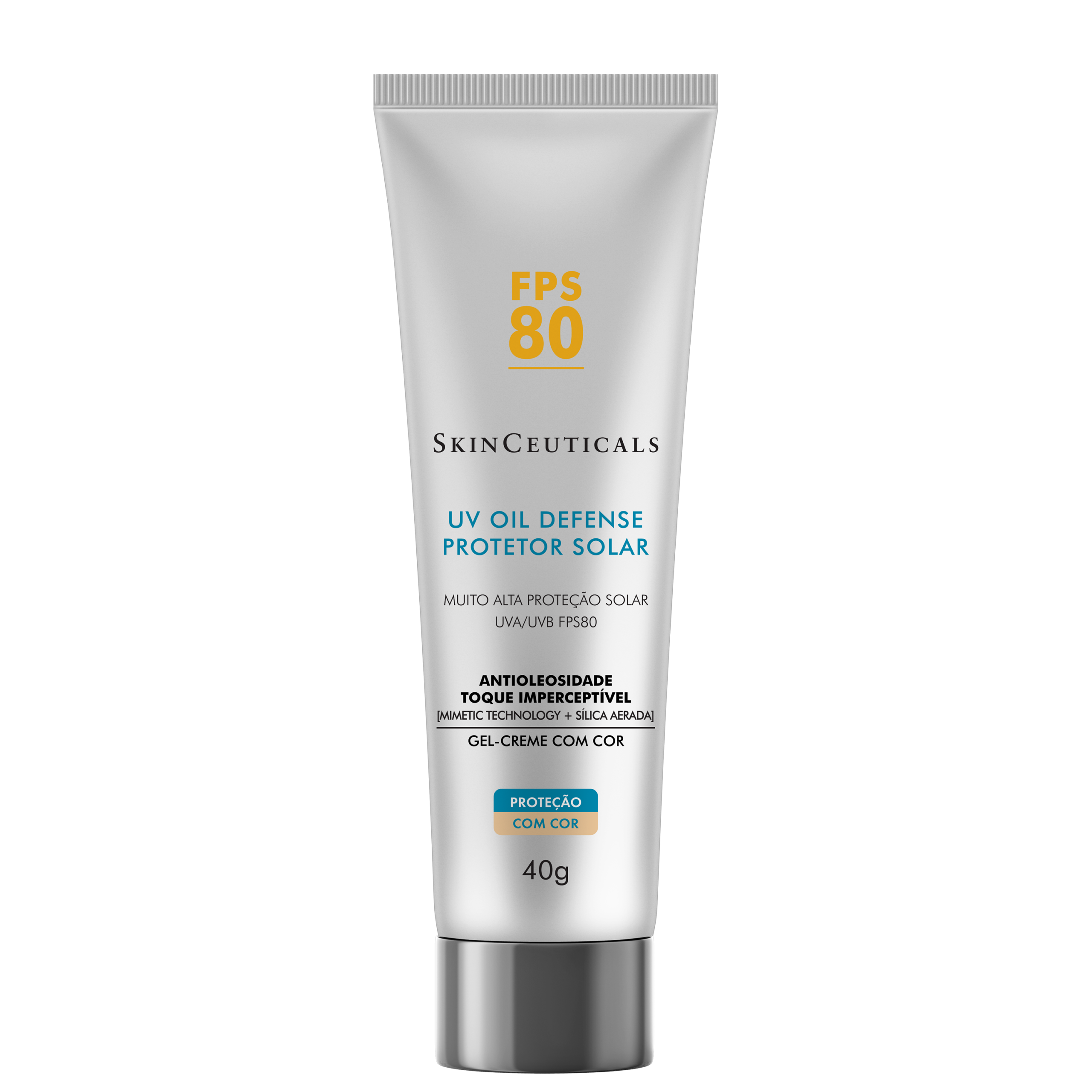 Detalhes SkinCeuticals UV Oil Defense FPS 80 Protetor solar facial com cor para todos os tipos de pele. SkinCeuticals UV Oil Defense FPS 80 traz alta proteção UVA, UVB e da luz visível, além de uniformizar o tom da pele com cobertura natural. Com textura leve e confortável, o Protetor Solar SkinCeuticals UV Oil Defense FPS 80 com Cor apresenta fórmula inovadora com efeito segunda pele e toque imperceptível. Conta com a ação da Sílica Aerada, capaz de garantir absorção da oleosidade ao longo do dia e controle do brilho. Com esse Protetor Solar SkinCeuticals com Cor, a pele fica com cobertura de cor que se adapta a diversos tons de pele, brilho controlado e protegida do envelhecimento proveniente da exposição ao sol e de aparelhos eletrônicos como computadores e celulares.