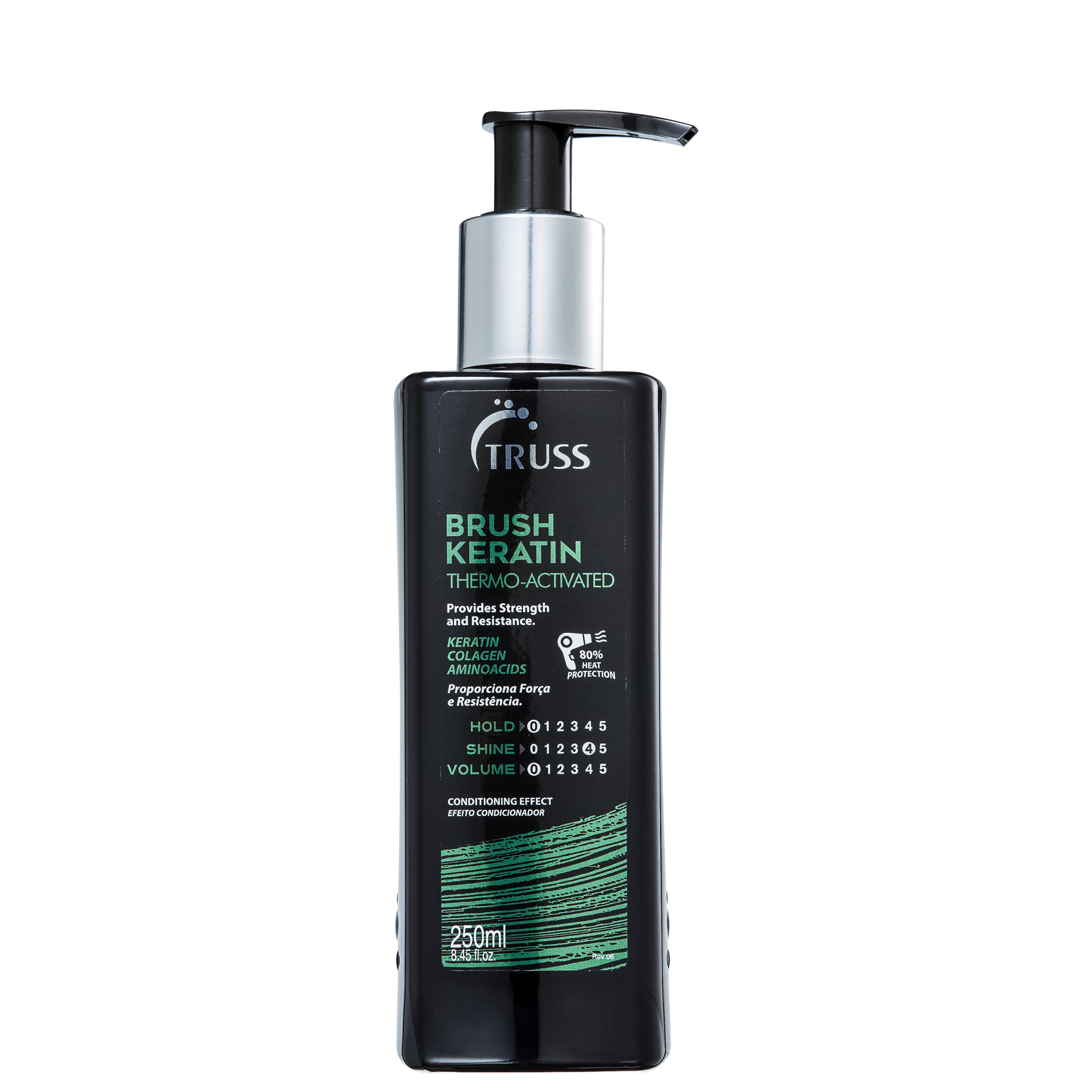 Detalhes TRUSS Brush Keratin Leave-in para cabelos danificados. Truss Brush Keratin confere resistência às fibras quebradiças e protege das agressões externas. O TRUSS Brush Keratin é o segredo para cabelos mais fortes, brilhantes e fáceis de pentear! Ativado pelo calor do secador, ele libera um complexo de proteínas e aminoácidos que reparam as cutículas danificadas por processos químicos e físicos. Experimente o poder reconstrutor do Brush Keratin TRUSS e desfrute de cabelos saudáveis, sedosos e com um brilho deslumbrante!